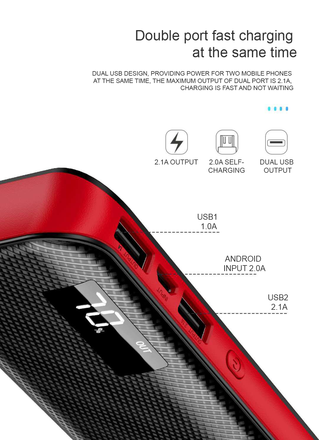 -une batterie externe polyvalente avec une capacité élevée, qui aidera en cas de panne de la batterie déchargée du téléphone et d’autres appareils. Pour vous connecter, vous pouvez utiliser 2 ports USB. Vous n’aurez donc pas besoin de charger une tablette, un smartphone, un appareil photo ou deux appareils en même temps. Pour contrôler la charge restante, ainsi que toutes les actions, un écran à LED pratique est fourni, avec un rétro-éclairage agréable pour les yeux, indiquant le pourcentage actuel de la charge de la batterie externe.
